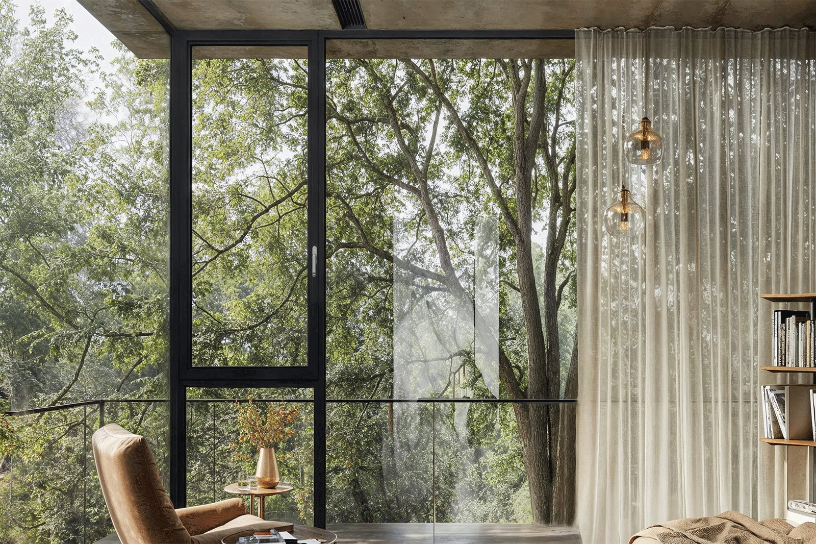 框扇室內外平齊設計,線條簡約利落,立面效果簡潔平整。窗扇開啟狀態,開啟扇與建筑外立面平行。